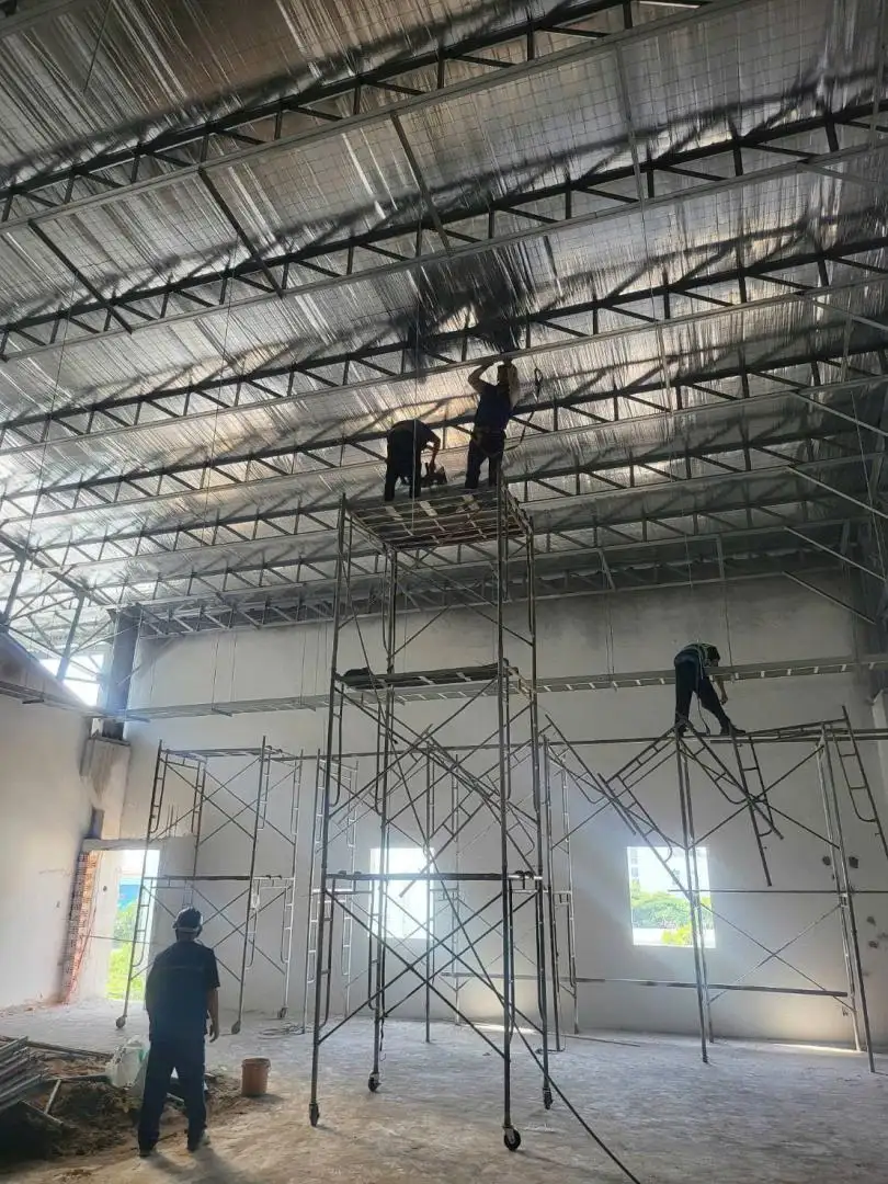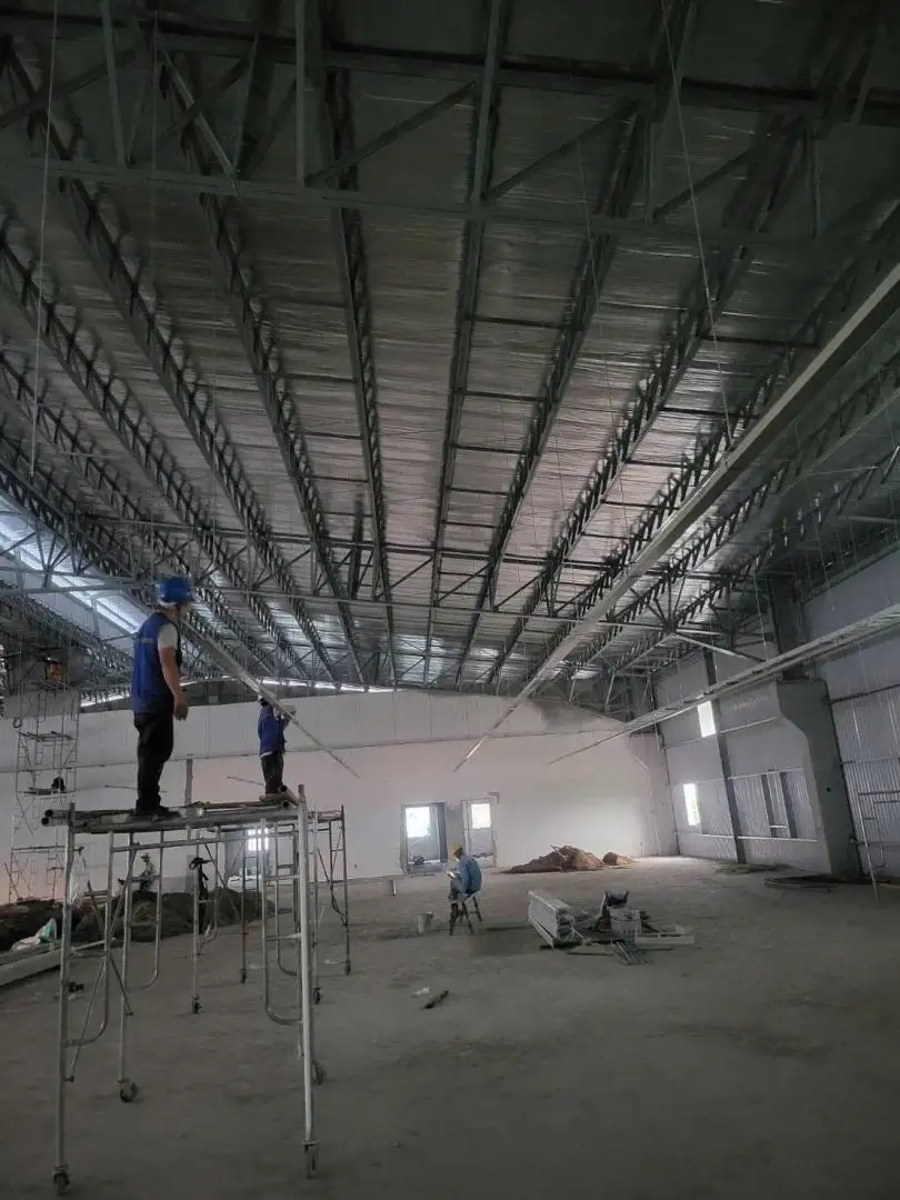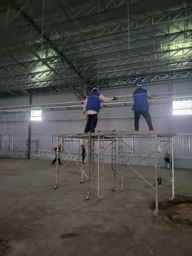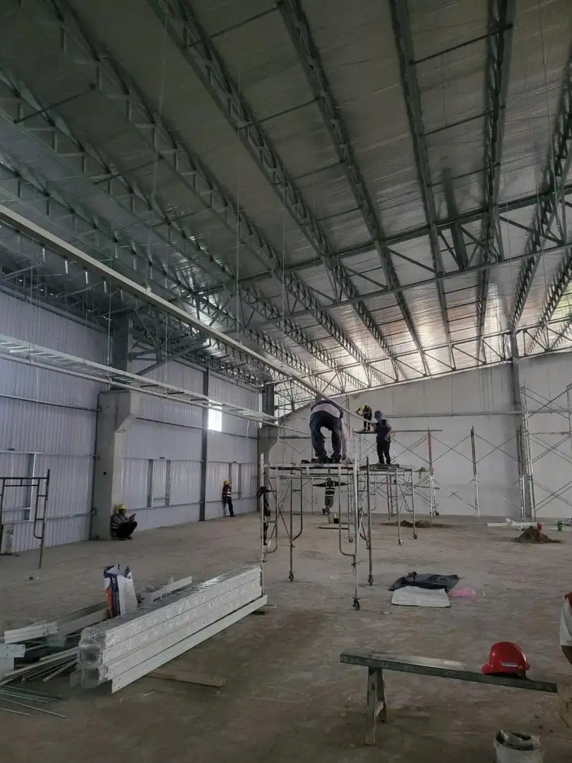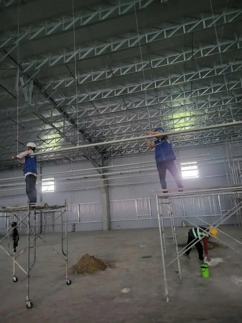 - Xây dựng móng, trụ, khung thép tiền chế, mái và tường bao.